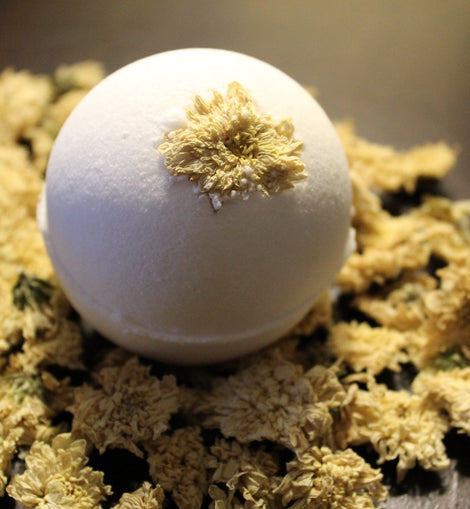 This bath bomb is topped with a dried chrysanthemum flower which is healing and safe for babies. Note: Bath bombs do contain oil and can make the tub a little slippery! Please be careful.